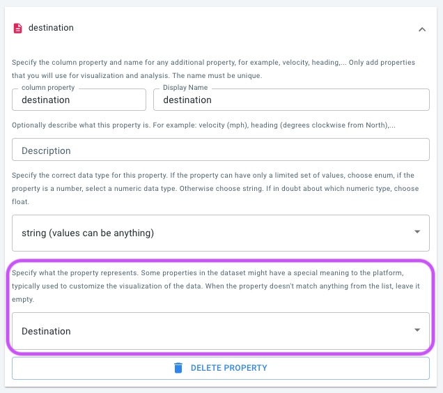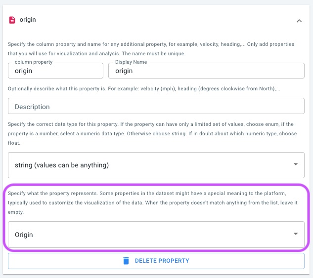The origin and destination identifiers are treated as standard data properties, and the exact interpretation of the data depends on whether the data set follows: