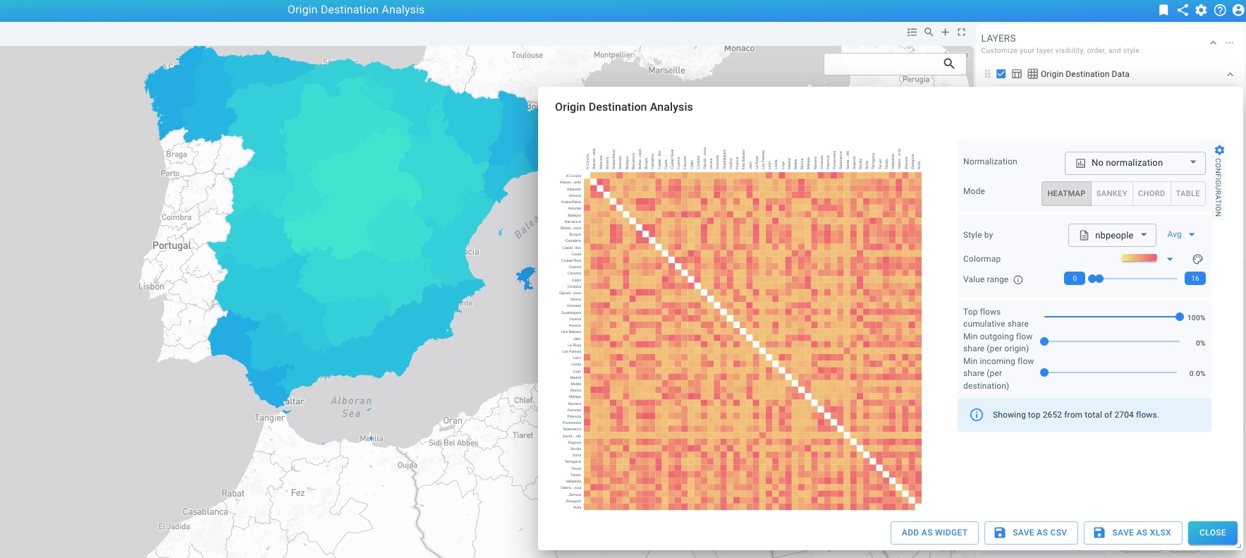Precomputed origin destination analysis allows you to analyze flows between fixed origins and destinations where the values are already aggregated by origin-destination pair. Time series of values over time (e.g., every 15 minutes) are supported.