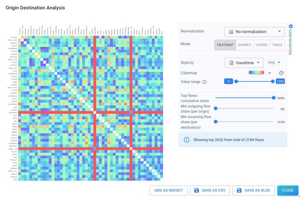 The heatmap visualizes the full origin destination matrix as a grid.