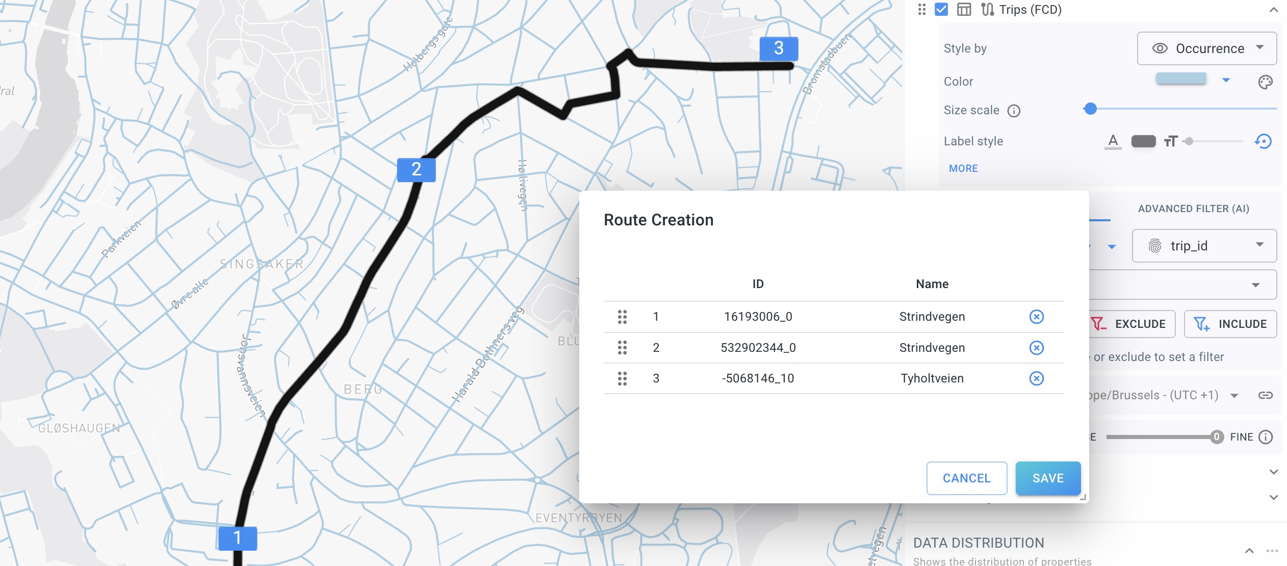 | Build routes in the travel direction you care about (for directional attributes). If direction matters in your use case, ensure you click segments in order. |