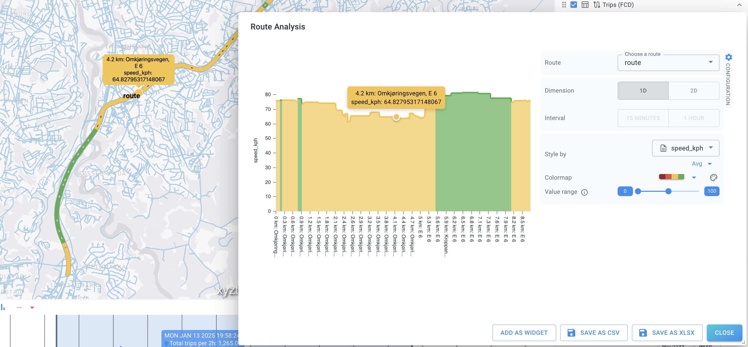 Hovering on the route on the map displays the value at that location.