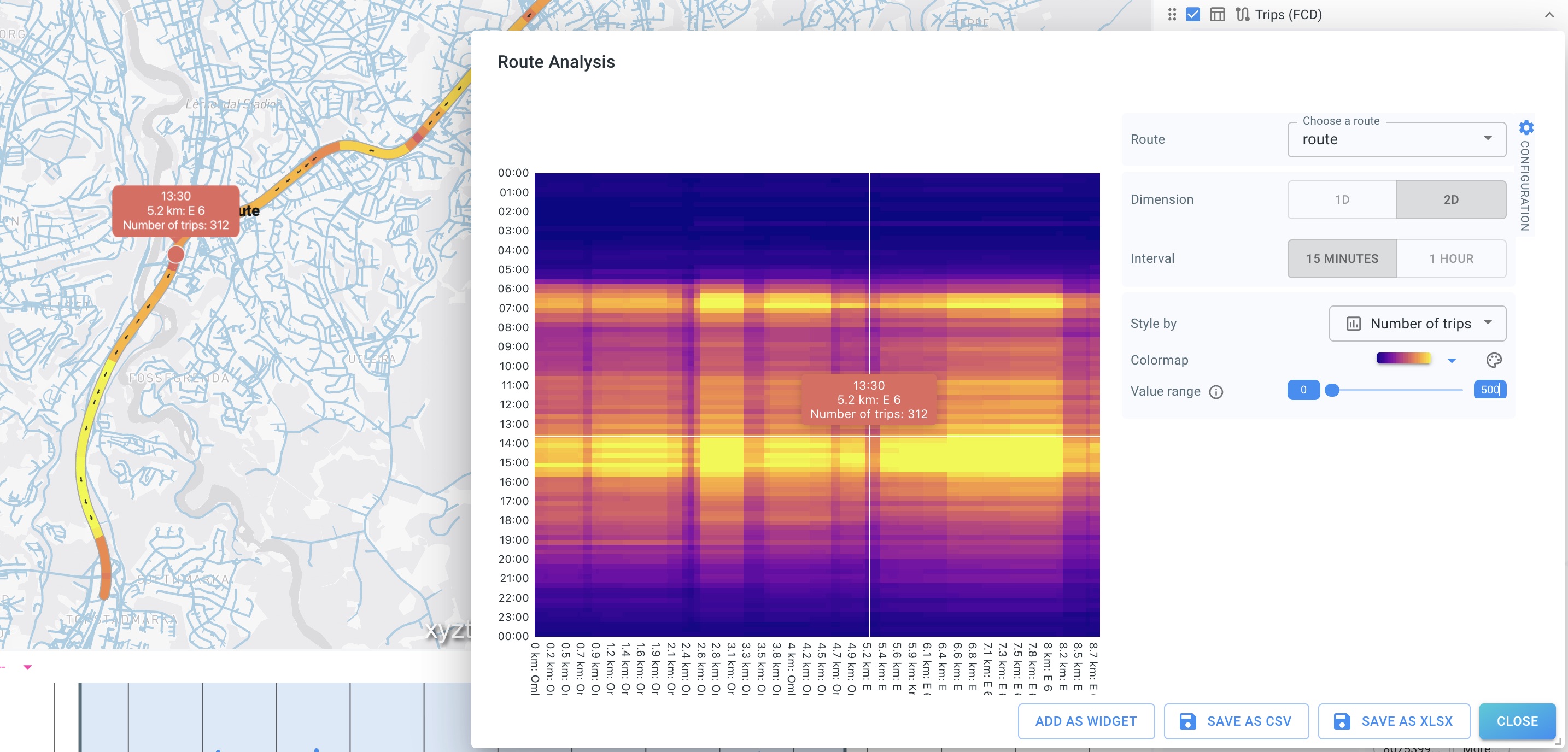 In 2D mode, the visualization becomes a heatmap across both route distance and time of day:
